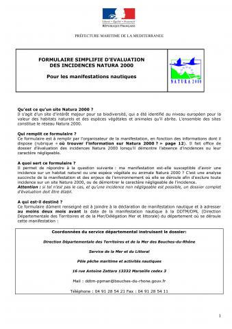 Dans le cadre d'une manifestation nautique de faible ampleur et de faible impact, vous pouvez utiliser le formulaire d'évaluation simplifiée de la DDTM des Bouches du Rhône, au format Word, en le téléchargeant via le lien suivant :