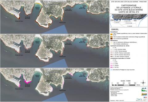 L'habitat "replats boueux ou sableux exondés à marée basse" est présent sur les 2,7 ha de plages et les 4,5 km de trait de côte du site. Le littoral de la Côte Bleue est dominé par la roche supralittorale (1170-10).